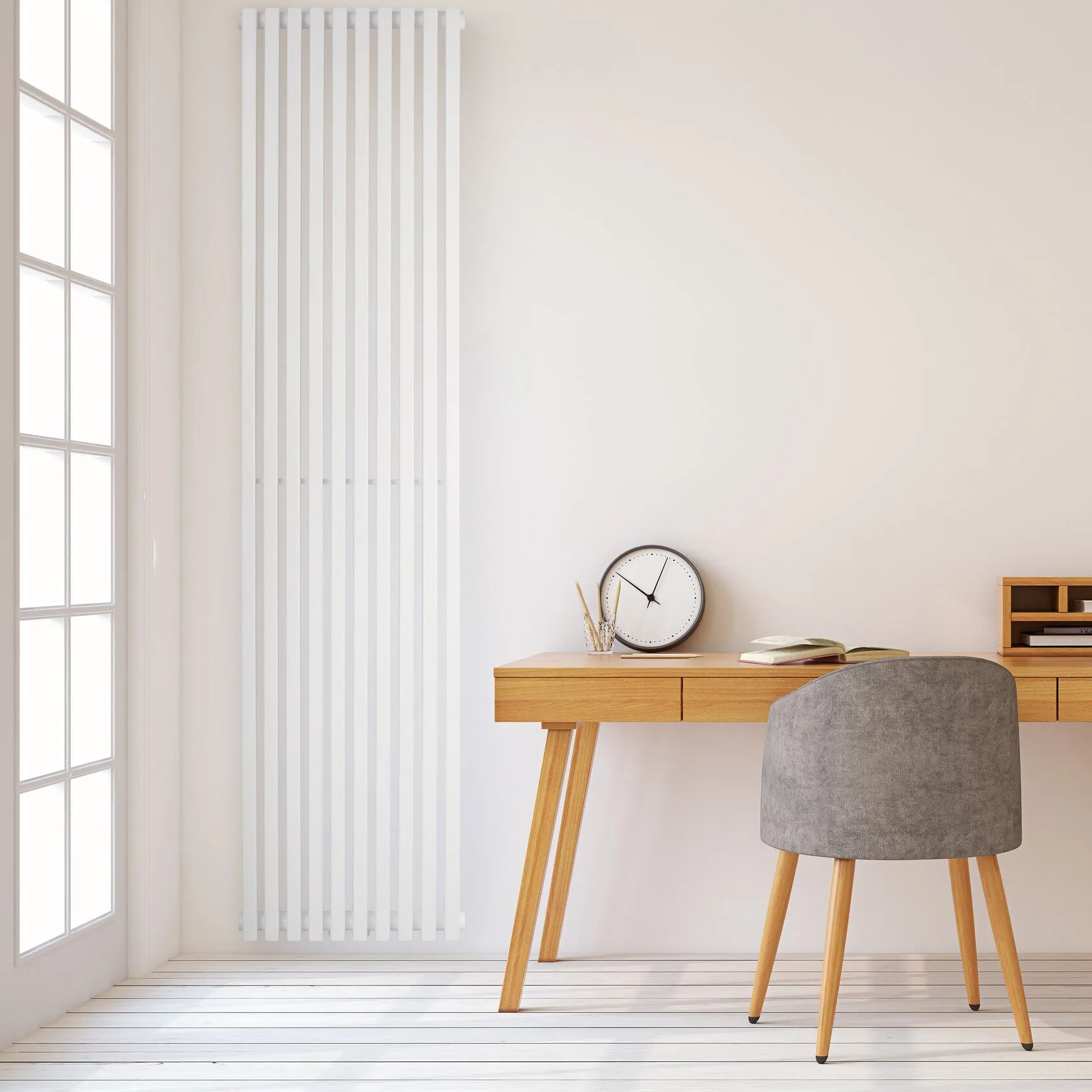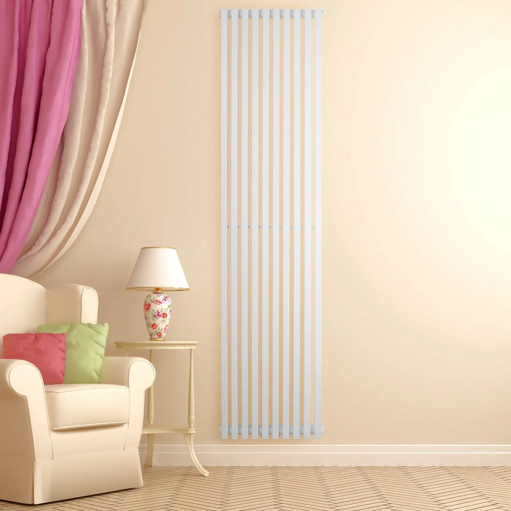 Quantum 1800×405 mm works well in living rooms, bedrooms, and home offices where comfortable temperature is needed without installing multiple radiators. The vertical format makes it easy to place between windows, near door openings, or on open wall sections.